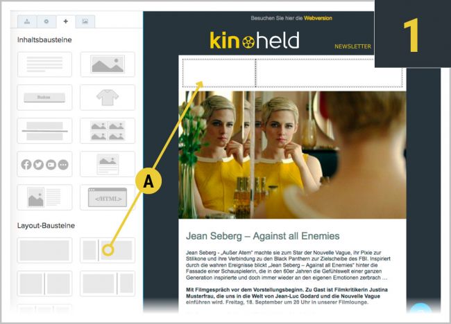 Ziehen Sie das passenden Layout-Baustein (A) mit der Maus an die gewünschte Stelle in Ihrer Vorlage. In unserem Beispiel haben wir das Element mit zwei asymmetrischen Spalten gewählt.