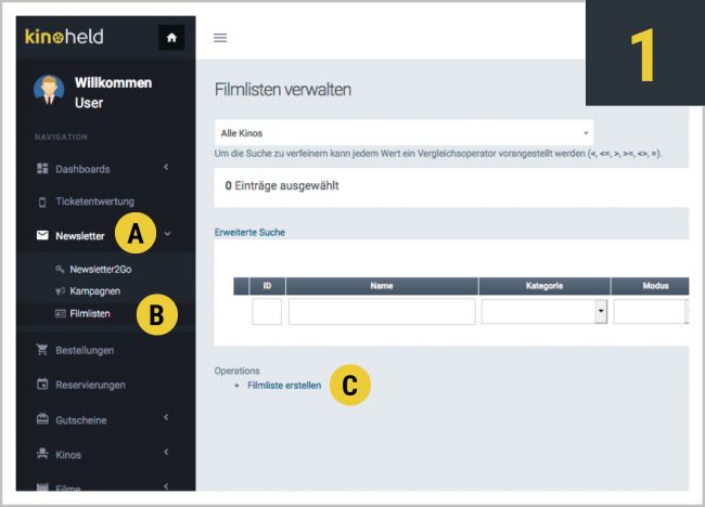 Navigieren Sie im Kinoheld Backoffice via Newsletter (A) zu den Filmlisten (B) und klicken dort unterhalb der Liste auf "Filmliste erstellen" (C).