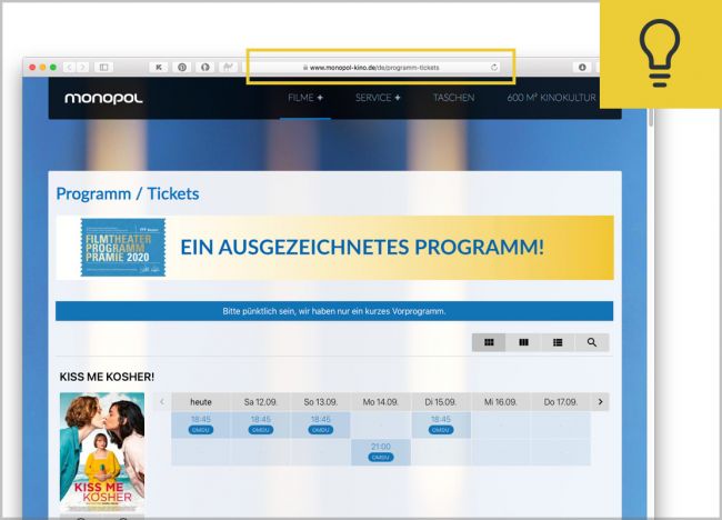 Jeder Film hat bei Webseiten von Cineprogra und Cineweb eine individuelle Adresse (URL). Öffnen Sie die gewünschte Filmseite und kopieren Sie den Link aus der Adressleiste im Browser.